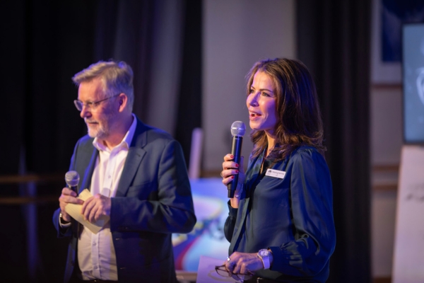 Adrian Packer and Natasha Kaplinsky address the cast of students (photo by John Palmer)