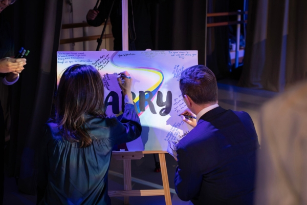 Natasha Kaplinsky and Patrick Harrison write notes on the poster with the late Harry Olmer’s name on it (photo by John Palmer)